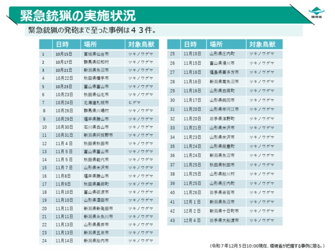 最も緊急銃猟が多く行われた山形県では、11月に入ってから事例が急増し、米沢市で複数回、庄内町、酒田市、長井市、白鷹町、鶴岡市、寒河江市、飯豊町、鮭川村など、広範囲で実施されています。(ちなみに対象期間の直後、12月5日夕方にも山形県長井市で13件目となる緊急銃猟が実施されている)