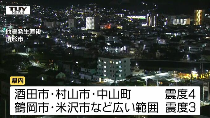 この地震で、県内では酒田市、村山市、中山町で震度4、鶴岡市や米沢市など広い範囲で震度3を観測しました。