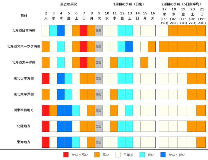 北・東日本の気温は、向こう4日間程度は平年並か低い日が多いですが、その後は平年並か高いでしょう。