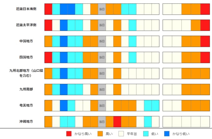 西日本と沖縄・奄美の向こう2週間の気温は、寒気の影響を受けにくいため平年並か高い日が多く、かなり高くなる所もあるでしょう。農作物の管理等に注意してください。