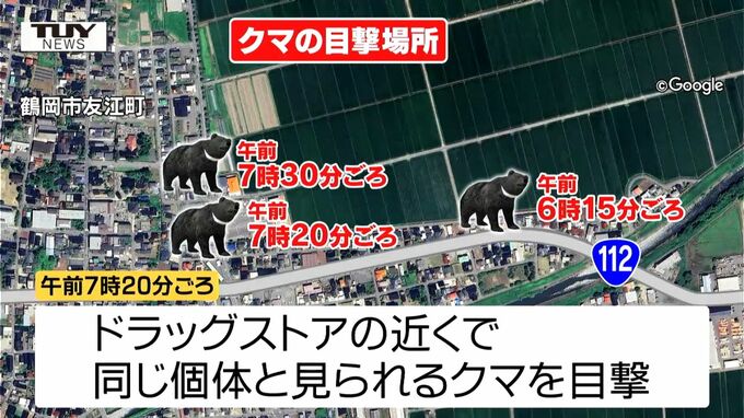 クマは体長およそ1.5メートルで一時行方がわからなくなりましたが、およそ1時間後の午前7時20分ごろ、鶴岡市友江町のドラッグストアの近くで同じ個体と見られるクマを近くにいた人が目撃しました。