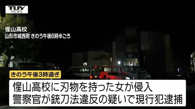 この事件はきのう午後3時過ぎ、山形市城西町の惺山高校に刃物を持った女が侵入したもので駆け付けた警察官が女を銃刀法違反の疑いで現行犯逮捕しました。