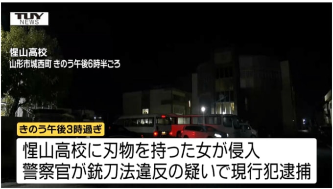 この事件はきのう午後3時過ぎ、山形市城西町の惺山高校に刃物を持った女が侵入したもので駆け付けた警察官が、女を銃刀法違反の疑いで現行犯逮捕しました。