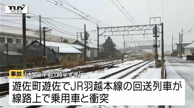 警察によりますと、きょう午前1時半すぎ、遊佐町遊佐でJR羽越本線の回送列車が、線路上で乗用車と衝突しました。