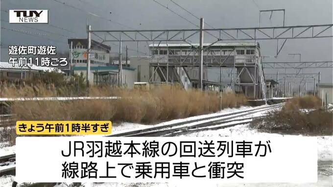 警察によりますと、きょう午前1時半すぎ、遊佐町遊佐でJR羽越本線の回送列車が、線路上で乗用車と衝突しました。