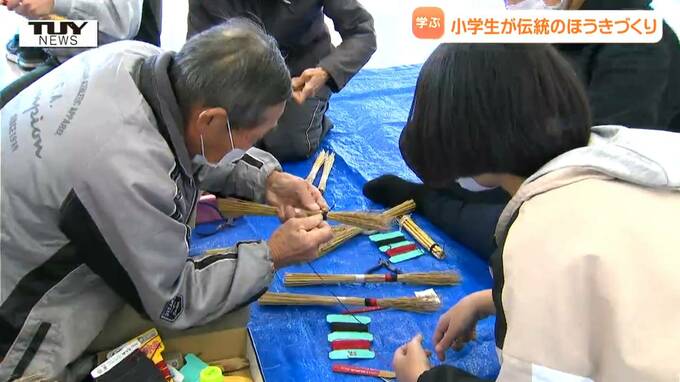 児童たちは、子どものころからほうきを作ってきた保存会のメンバーから教えてもらいながらほうきを作っていきます。