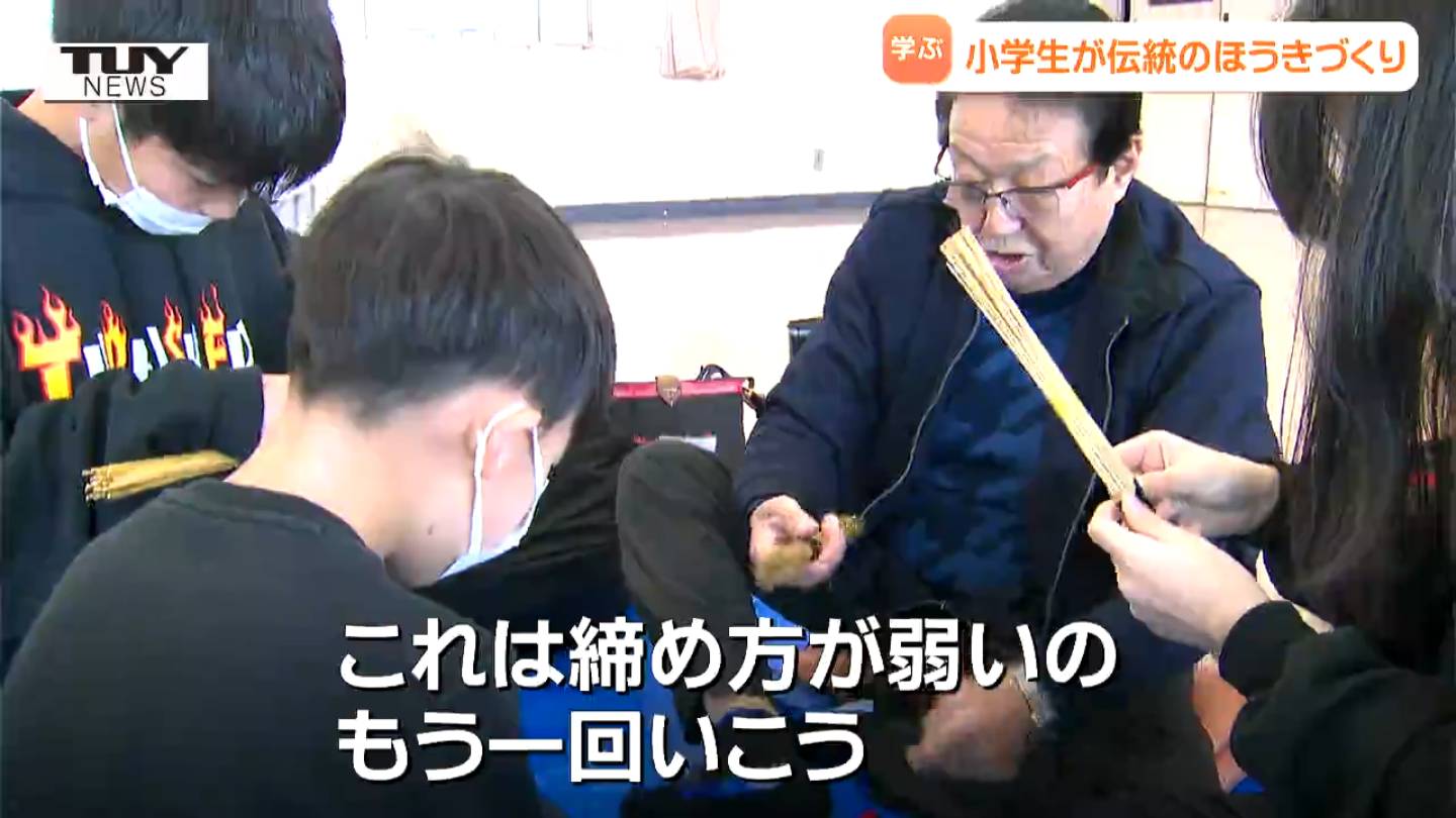 児童たちは、子どものころからほうきを作ってきた保存会のメンバーから教えてもらいながらほうきを作っていきます。