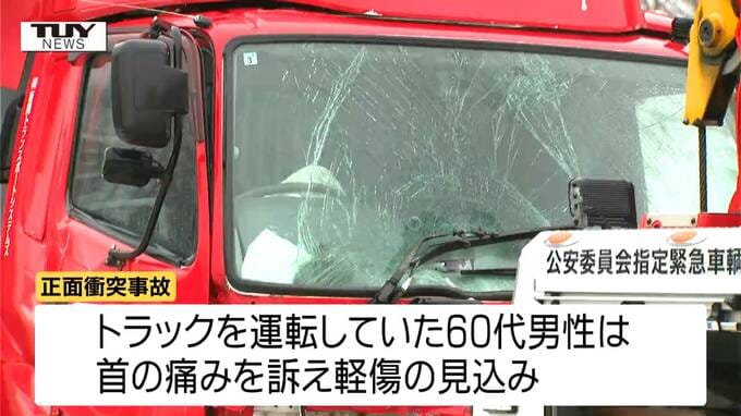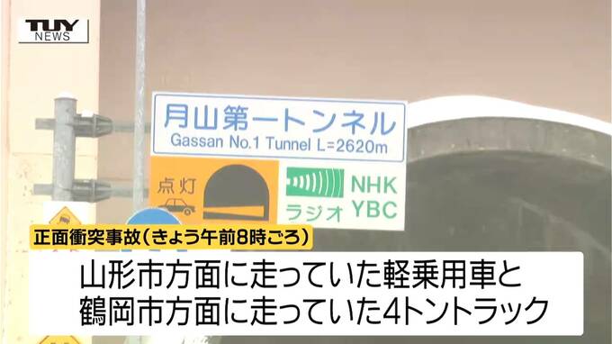 警察や消防によりますと、きょう午前8時ごろ、鶴岡市田麦俣の月山第一トンネル付近で、山形市方面に向かって走っていた軽乗用車と、鶴岡市方面に向かって走っていた4トントラックが、正面衝突する事故がありました。