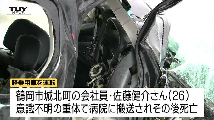 この事故で、軽乗用車を運転していた鶴岡市城北町の会社員、佐藤健介さん(26)が腹や胸を強く打ち、意識不明の重体で病院に搬送されましたが、その後、死亡が確認されました。