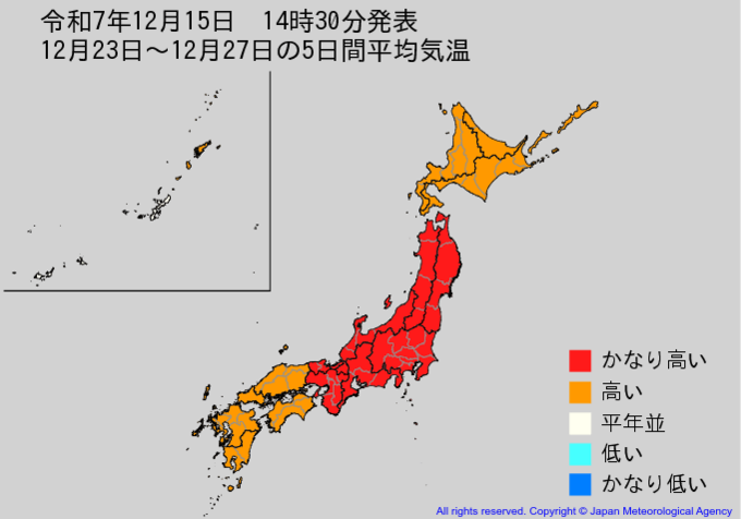【2週間気温予報】東北地方の向こう2週間の気温は高い日が多い予報 20日頃からはかなり高くなる見込み 東北・全国の天気を画像で 気象庁 2025年12月15日(月) 16:17 国内 ■12月23日~12月27日の5日間平均気温 ・8日先から12日先まで5日間平均した日平均気温を表示しています。 ・かなり高い(かなり低い)は、かなり高い(かなり低い)気温となる確率が30%以上のときに表示します。