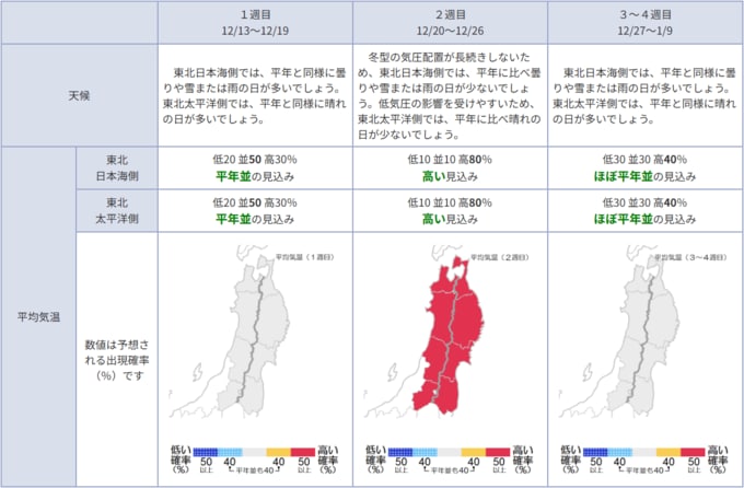 東北日本海側:平年並の見込み 東北太平洋側:平年並の見込み