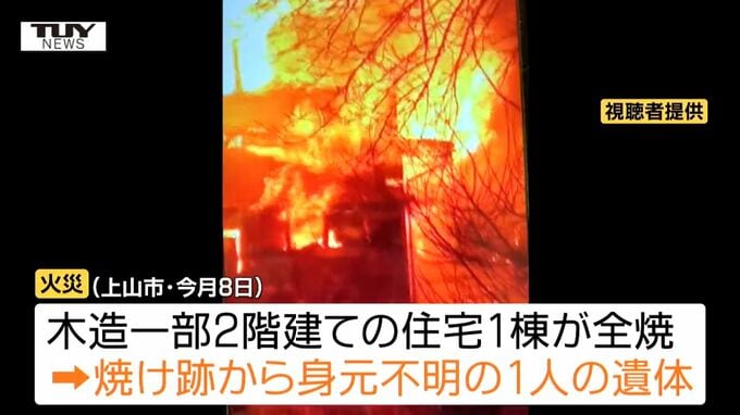 今月8日、山形県上山市で住宅1棟が全焼した火災で、焼け跡から発見された遺体が、この家に住む90歳の男性であったことがわかりました。