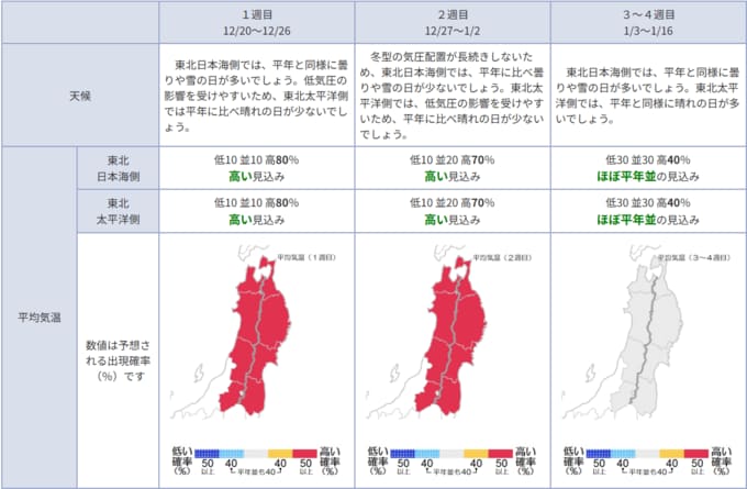 東北日本海側:ほぼ平年並の見込み 東北太平洋側:ほぼ平年並の見込み