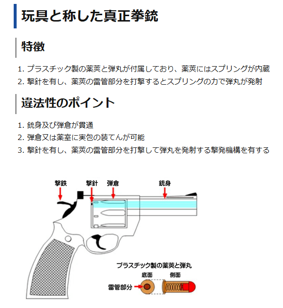 玩具と称する銃の「違法のポイント」は・・・銃身と弾倉が貫通していて、弾丸の装てんができること、弾丸の一部を叩くことができる「撃針」と呼ばれる部分があることだとしています。(参考画像:警察庁)