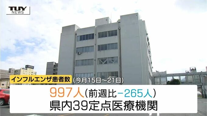県衛生研究所によりますと、今月15日から21日までに県内39の定点医療機関から報告があったインフルエンザの患者数は、前の週より265人減少し997人でした。