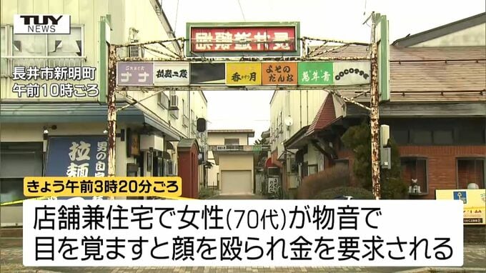 警察によりますときょう午前3時20分ごろ、長井市新明町の店舗兼住宅で、70代の女性が物音で目を覚ましたところ、顔面を殴られ金を要求されたということです。