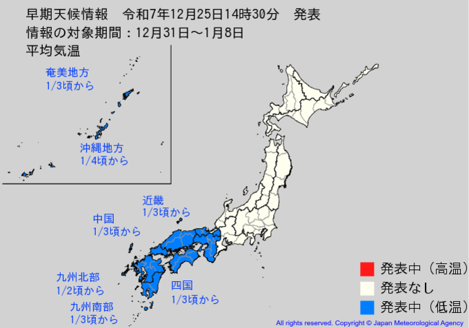 近畿地方の気温は、向こう3日間程度は平年並か低いですが、その後は暖かい空気に覆われやすいため、12月31日頃までは高いでしょう。1月3日頃からは強い寒気が流れ込むため、平年並か低く、かなり低くなる可能性があります。また、1月3日頃からは、近畿日本海側では降雪量がかなり多くなる可能性があります。農作物の管理や水道管の凍結等に注意するとともに、交通障害や除雪などの対応に留意してください。また、今後の気象情報等に留意してください。