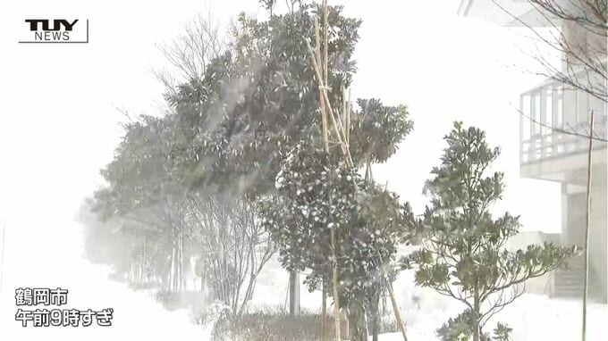 午前9時過ぎの鶴岡市です。横殴りの雪が降り、木々が大きく揺れています。
