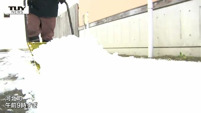 こちらは午前9時過ぎの河北町です。大粒の雪で視界が悪く、歩きながら傘に積もった雪を払う人や、雪の止み間にスノーダンプで雪かきをする人の姿も見られました。