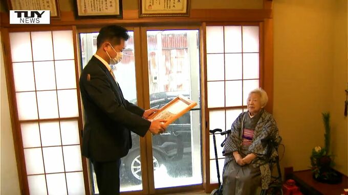 山形県鶴岡市ではきょう、今年で数え年100歳を迎える人に長寿のお祝いが贈られました。