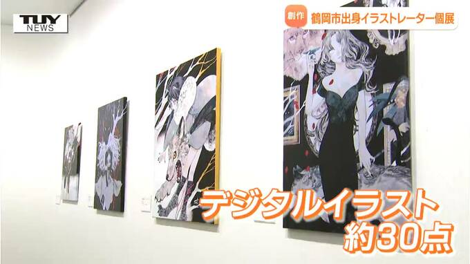 山月さんは東北芸術工科大学を卒業後、主に書籍装画や漫画、ゲームなどの分野で活動していて、自身初となる今回の個展ではタブレット端末などを使って描いたデジタルイラスト、およそ30点が展示されています。