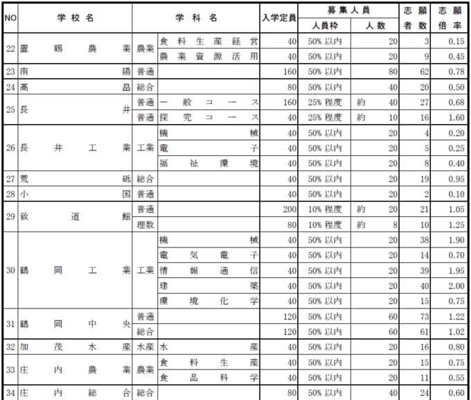 長井の探究も高く、県内総じて探究科の倍率が高くなっている。