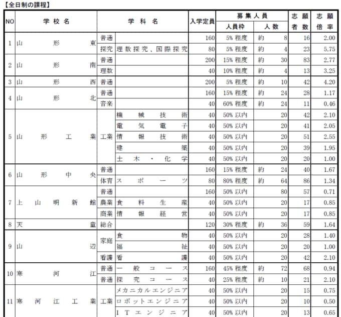 山形県は、今回から実施する県公立高校前期(特色)選抜試験の志願倍率を発表した。