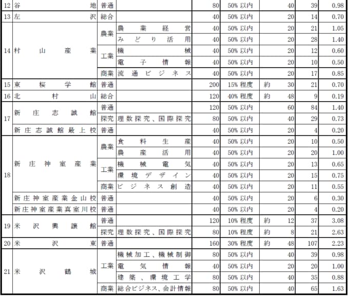 米沢興譲館の普通、探究、米沢東の普通も高くなっている。
