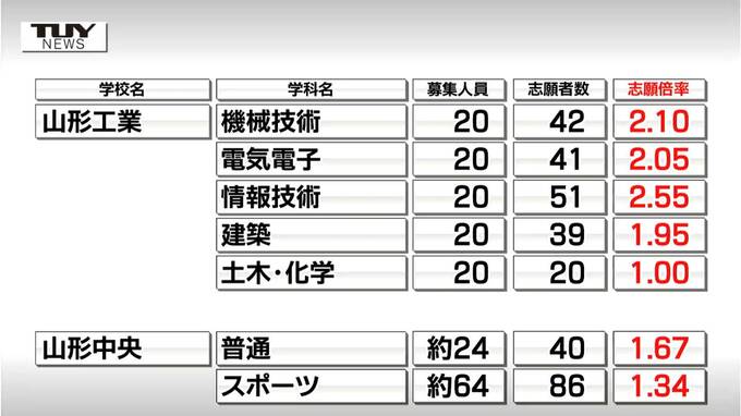 山形工業はいずれの学科も1倍を超えていて最も高いのは情報技術の2.55倍となっています。山形中央は普通科が1.67倍、スポーツ科は1.34倍となっています。