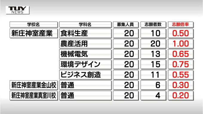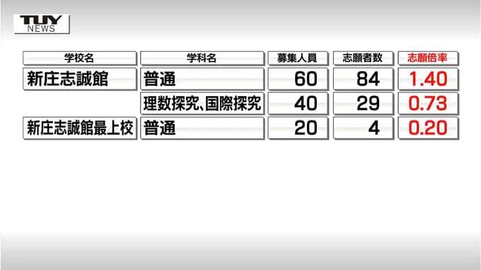【動画】2026年度入学 山形県公立高校入試前期試験(特色選抜) 志願倍率発表 全体の志願倍率は1.12倍 公立高等学校全校掲載 2026年1月8日(木) 18:58 国内 ■最上地方は 続いて最上地方です。 新庄志誠館普通科は1.40倍、探求科は0.73倍となっています。 新庄神室産業農産活用科は、1.00倍、そのほかのすべての学科で定員割れです。