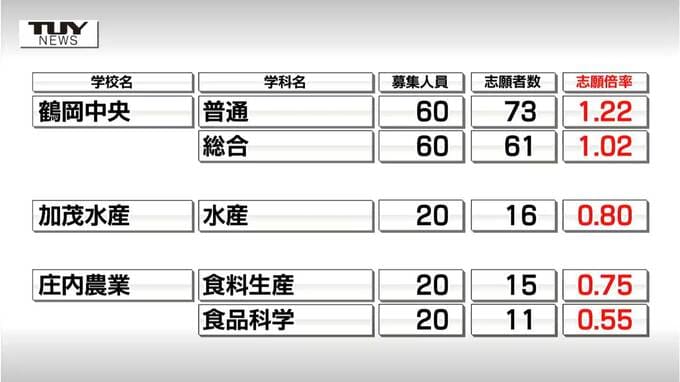 鶴岡中央は普通科1.22倍、総合科1.02倍、加茂水産、庄内農業はいずれも定員割れです。
