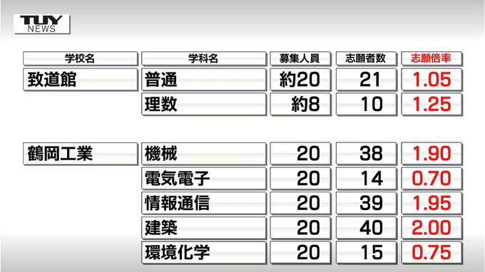 致道館は普通科が1.05倍、理数科は1.25倍となっています。鶴岡工業は情報通信が1.95倍となっています。