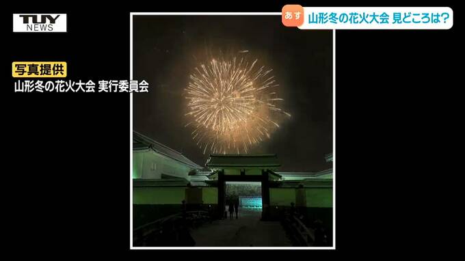 山形冬の花火大会 船山隆幸 実行委員長「東大手門のシャチホコ越しに見る…」