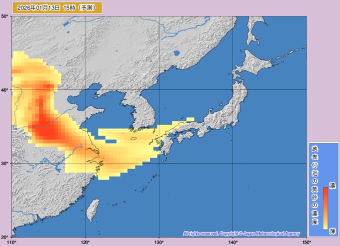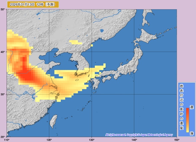 【黄砂情報】13日~15日は日本列島に黄砂飛来か...1月10日~1月13日の黄砂シミュレーション いつどこに、どれくらい飛んでくる? 黄砂を上空から見たデータで確認 気象庁発表 2026年1月12日(月) 12:00 国内 ■黄砂はいつどこに?(13日)