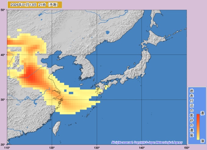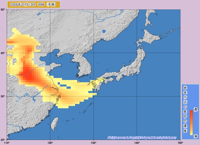 【黄砂情報】13日~15日は日本列島に黄砂飛来か...1月10日~1月13日の黄砂シミュレーション いつどこに、どれくらい飛んでくる? 黄砂を上空から見たデータで確認 気象庁発表 2026年1月12日(月) 12:00 国内 ■13日夜は九州・四国に