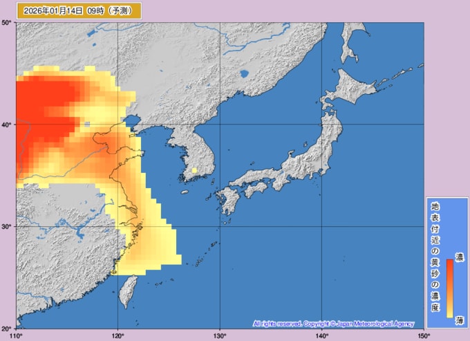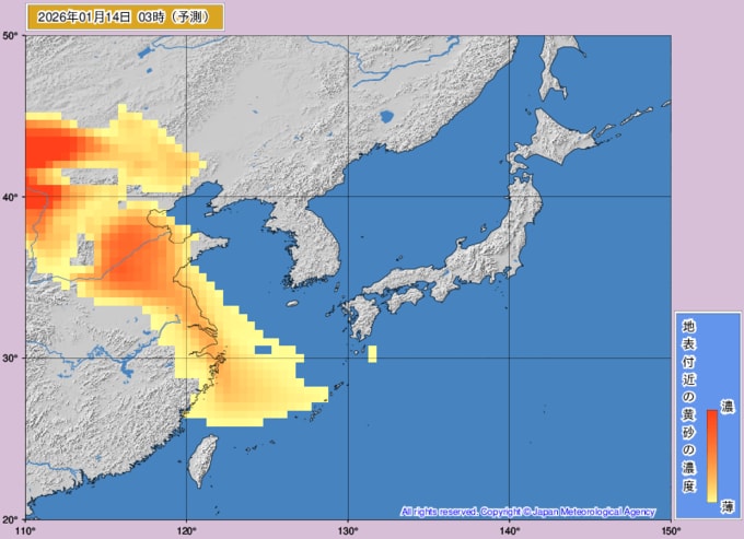 【黄砂情報】13日~15日は日本列島に黄砂飛来か...1月10日~1月13日の黄砂シミュレーション いつどこに、どれくらい飛んでくる? 黄砂を上空から見たデータで確認 気象庁発表 2026年1月12日(月) 12:00 国内 ■黄砂はいつどこに?(14日)
