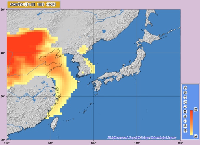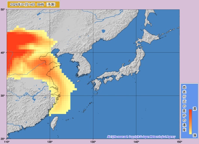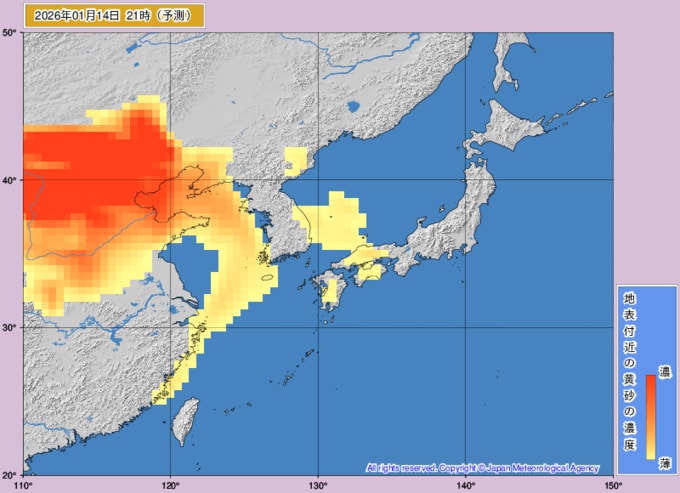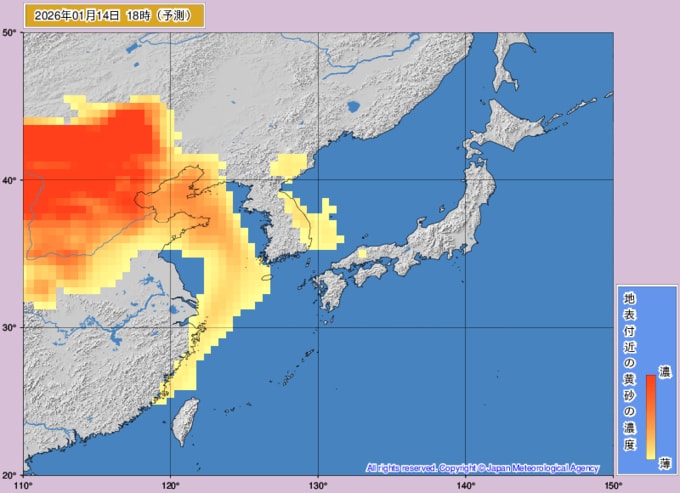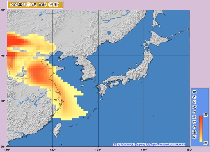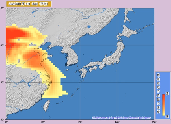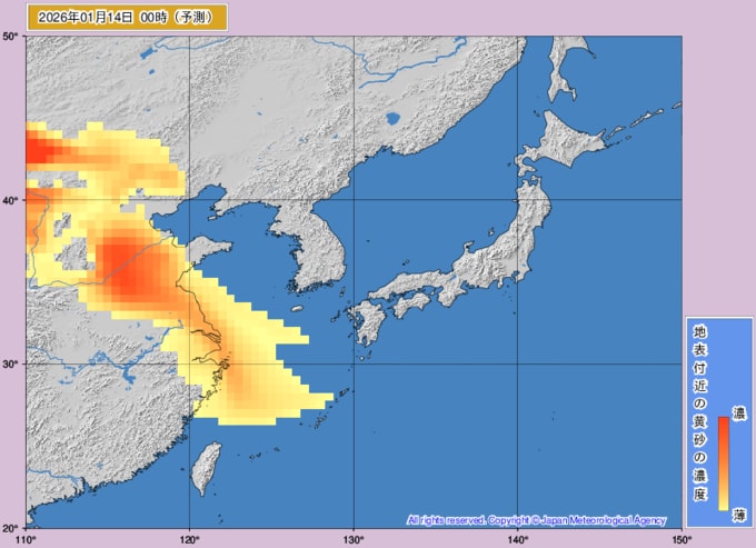 【黄砂情報】16日は日本列島の広範囲に黄砂飛来か...13日~16日の黄砂シミュレーション いつどこに、どれくらい飛んでくる? 黄砂を上空から見たデータで確認 気象庁発表 2026年1月13日(火) 12:00 国内 ■黄砂はいつどこに?(14日)