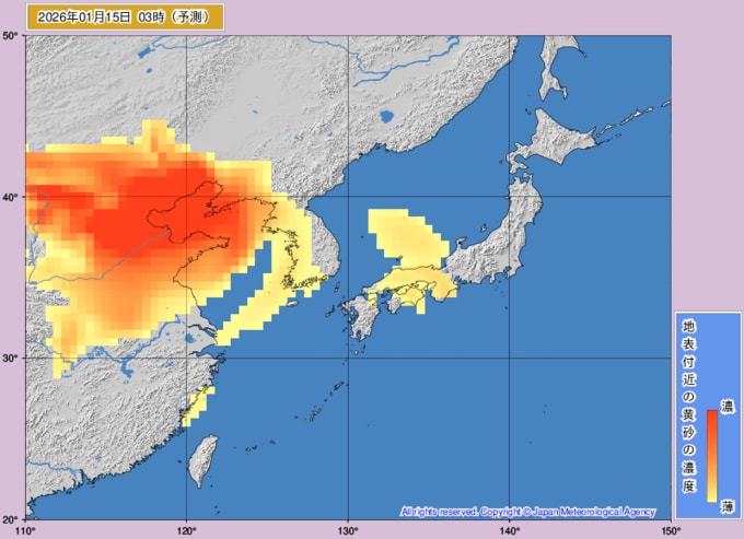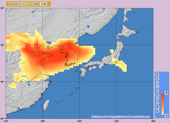 【黄砂情報】16日は日本列島の広範囲に黄砂飛来か...13日~16日の黄砂シミュレーション いつどこに、どれくらい飛んでくる? 黄砂を上空から見たデータで確認 気象庁発表 2026年1月13日(火) 12:00 国内 ■黄砂はいつどこに?(15日)
