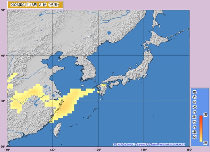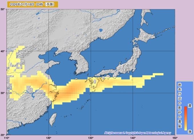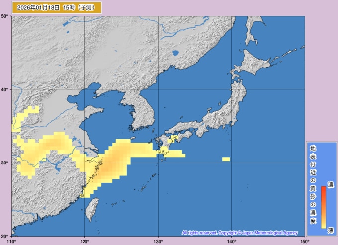 【黄砂情報】16日、17日は日本列島の広範囲に飛来か...15日~18日の黄砂シミュレーション いつどこに、どれくらい飛んでくる? 黄砂を上空から見たデータで確認 気象庁発表 2026年1月15日(木) 12:00 国内 ■18日は ※画像は気象庁より
