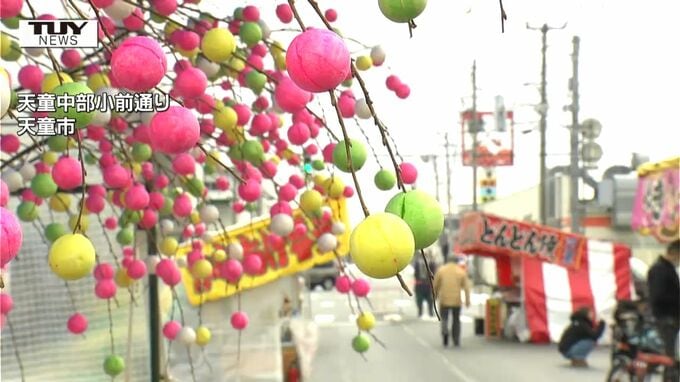 天童市の初市には、だんご木などの縁起物が並びました。年々、小規模になっていますが賑わっているところもありました。