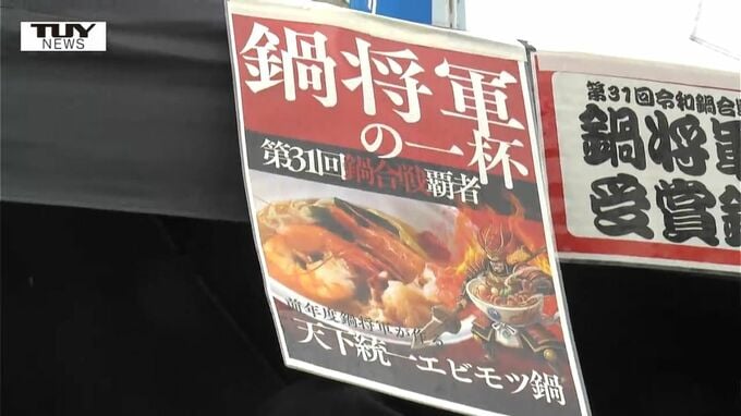 振る舞われたのは、人気イベント「令和鍋合戦」で去年最高賞に輝いた「天下統一エビモツ鍋」。