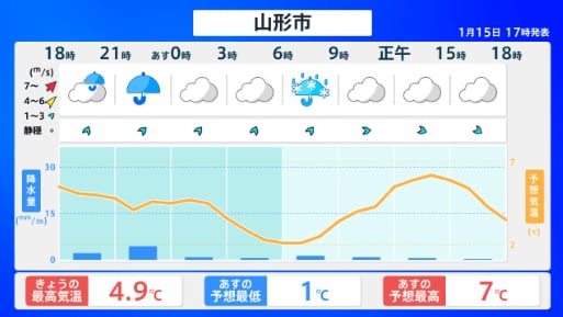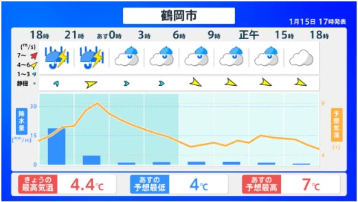 【山形天気】庄内の海上では15日夜遅くにかけて西よりの強い風に注意・警戒 山形・全国の天気を画像で 気象庁 2026年1月15日(木) 20:30 国内 ■山形・全国の天気 画像はTBS NEWS DIG Powered by JNNより 画像ありの記事を最初から https://newsdig.tbs.co.jp/articles/-/2403964?display=1
