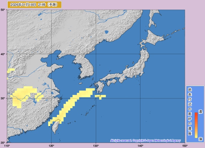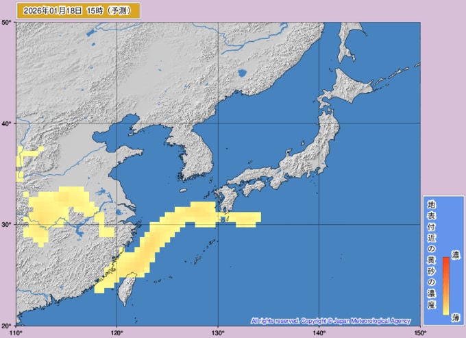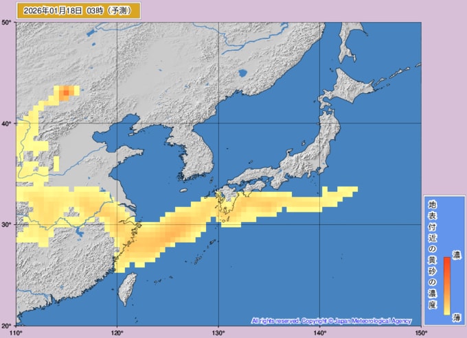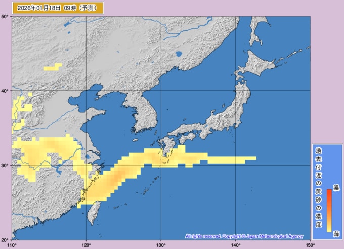 【黄砂情報】日本列島の広範囲に飛来か...16日~18日の黄砂シミュレーション いつどこに、どれくらい飛んでくる? 黄砂を上空から見たデータで確認 気象庁発表 2026年1月16日(金) 10:59 国内 ■18日は 画像は気象庁より
