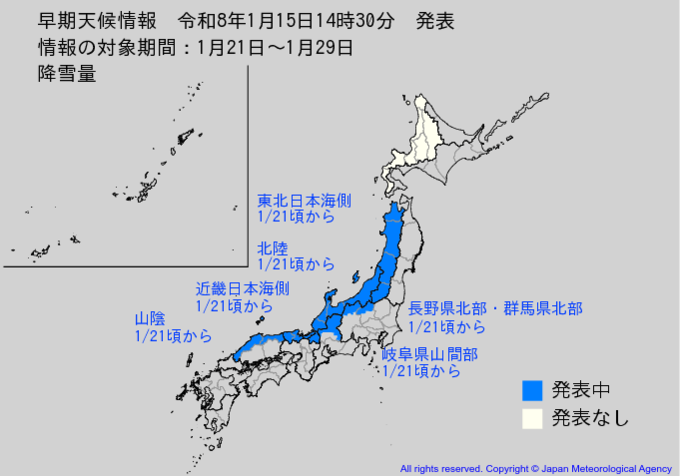 東北日本海側 1月21日頃から 大雪