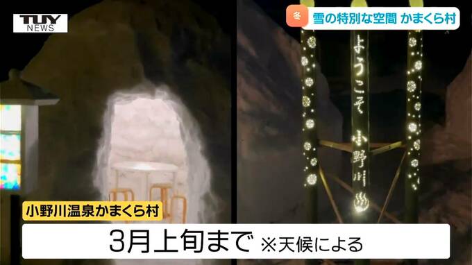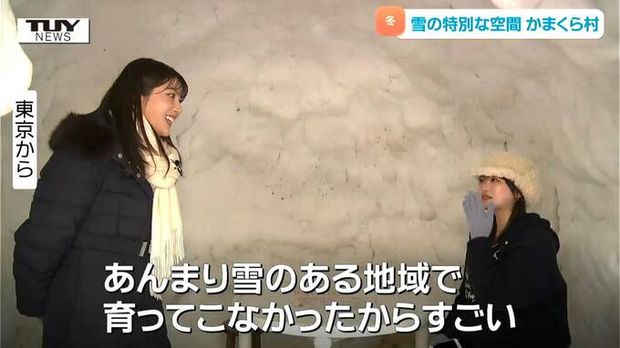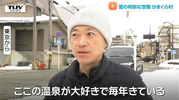 東京から「ここの温泉が大好きで毎年来ている」Qかまくらどう?「いい感じ」Q入ってみてどう?「ちょっとあったかかった」