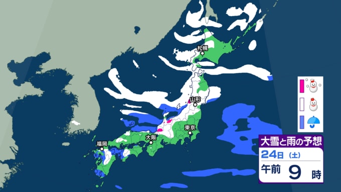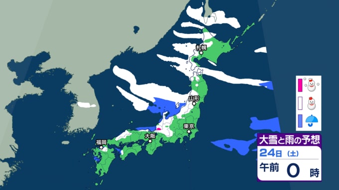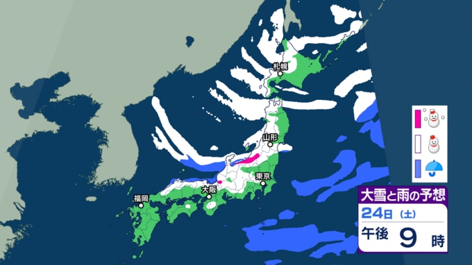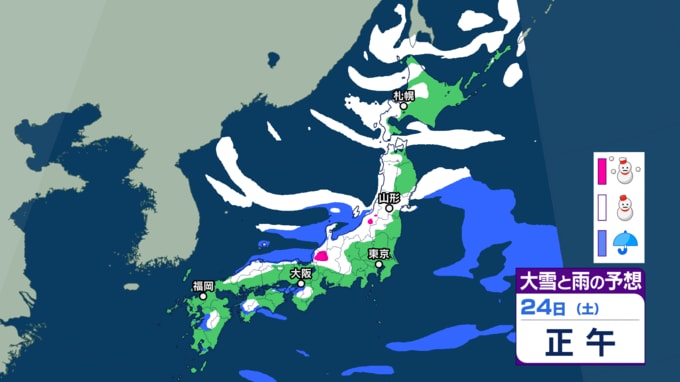 大雪情報 いつ・どこで雪降る?【21日~25日の降雪シミュレーション】寒波襲来...北日本から西日本では25日頃にかけて平地でも大雪に 24時間予想降雪量は? 東北の天気はどうなる? 2026年1月21日(水) 12:55 国内 24日の雪と雨の予報