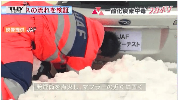 こちらJAFの実験した画像を見てください。大雪や吹きだまりにはまって、車が雪に埋もれたとの想定です。わかりやすいように車体の下に発煙筒を入れて、煙(ガスに見立てる)の動きで見ていく実験です。