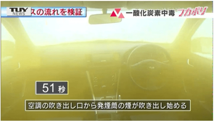 そしてボンネット付近の吸気口から、エアコンを外気導入にしていた場合は特に早くガスが車内に入っていきます。これが予想以上に早い。一分程度で車内に排気ガスが充満してしまうことがわかりました。