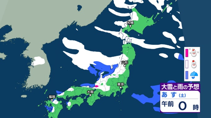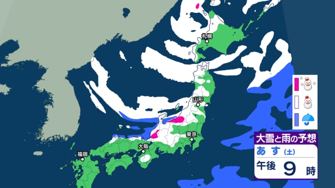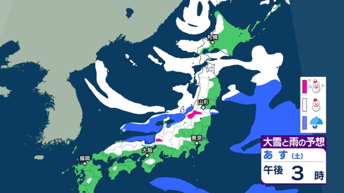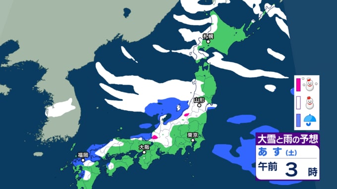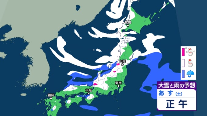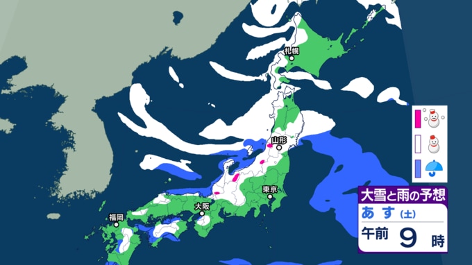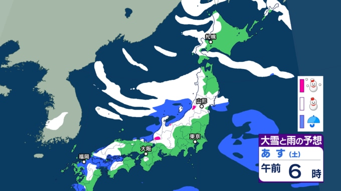 寒波襲来で今週末は大雪に...【24日~25日の降雪シミュレーション】いつ・どこで雪降る? 東北地方と東日本では24日から25日にかけて大雪や路面の凍結による交通障害に警戒 各地方の24時間予想降雪量は? 大雪情報 気象庁 2026年1月23日(金) 20:56 国内 ■雪と雨のシミュレーション(画像) 24日の雪と雨の予報