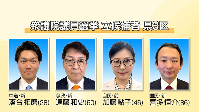 県3区は、中道改革連合の新人・落合拓磨さん(28)、参政党の新人・遠藤和史さん(60)、自民党の前職・加藤鮎子さん(46)、国民民主党の新人・喜多恒介さん(36)の4人です。